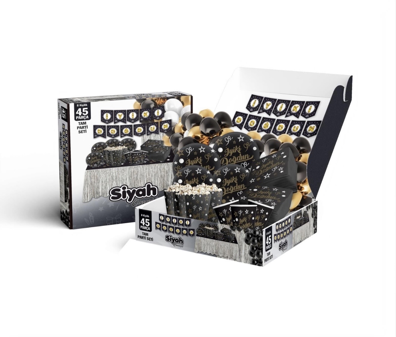 İÇERİĞİ 8 ADET BARDAK 8 ADET TABAK 8 ADET PEÇETE 8 ADET MISIR KUTUSU 8 ADET BALON1 ADET MASA ETEĞİ 1 ADET MASA ÖRTÜSÜ 2 ADET ARKA FON PERDE 1 ADET BANNER